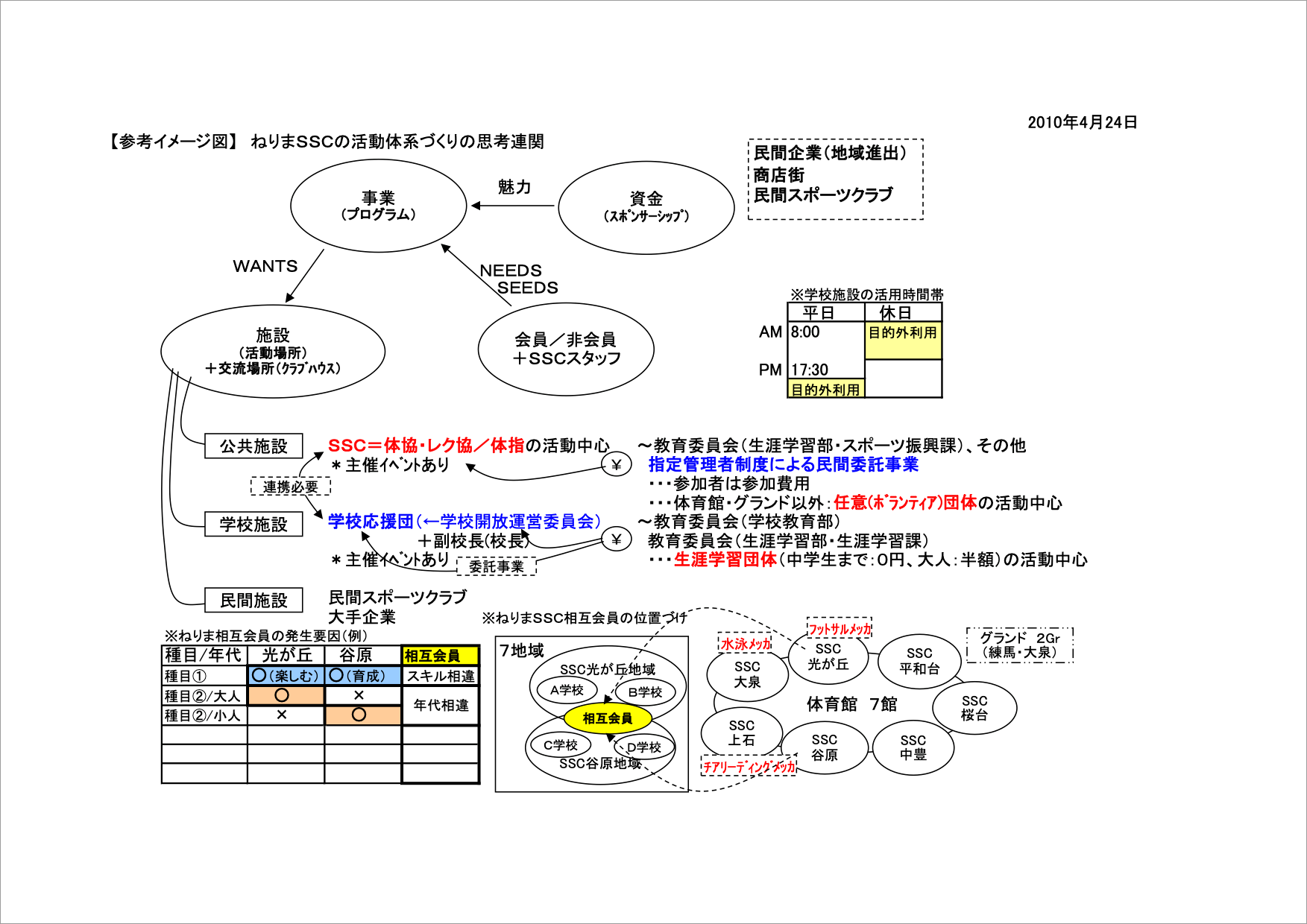 これをモデルとして、練馬区では、文部科学省より都市型の総合型地域スポーツクラブ 育成モデル地区として指定を受け、区内6つの体育館を拠点に、SSC設立を推進して、 今では7つのSSCがNPO法人として立ち上がって活動しており、