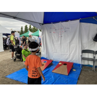 私たち7つのSSCは協力してブースを運営、出し物は「コーンホール」というゲームを行いました。小さな穴の的をめがけてお手玉のような布製のボールを入れて競うゲームです。