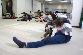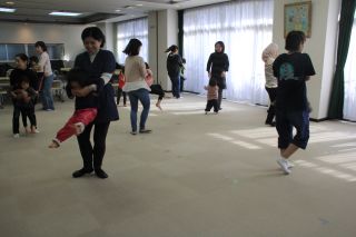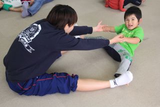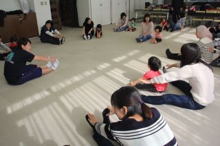 | 最初に準備運動、いいですかー | 足を開いて右に倒しまーす・ お母さんと一緒に |