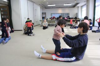 | 先生の膝の上にしっかり乗ってね・上げて行くよー | 両手足を伸ばして腹筋運動よ |