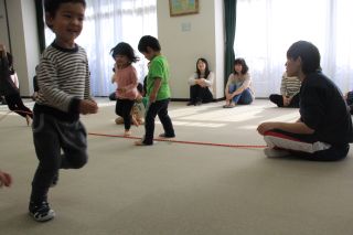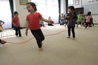 | 横波の縄を踏まないで跳ぶのよー | 今度は縄をだんだん高くして行くからねー |